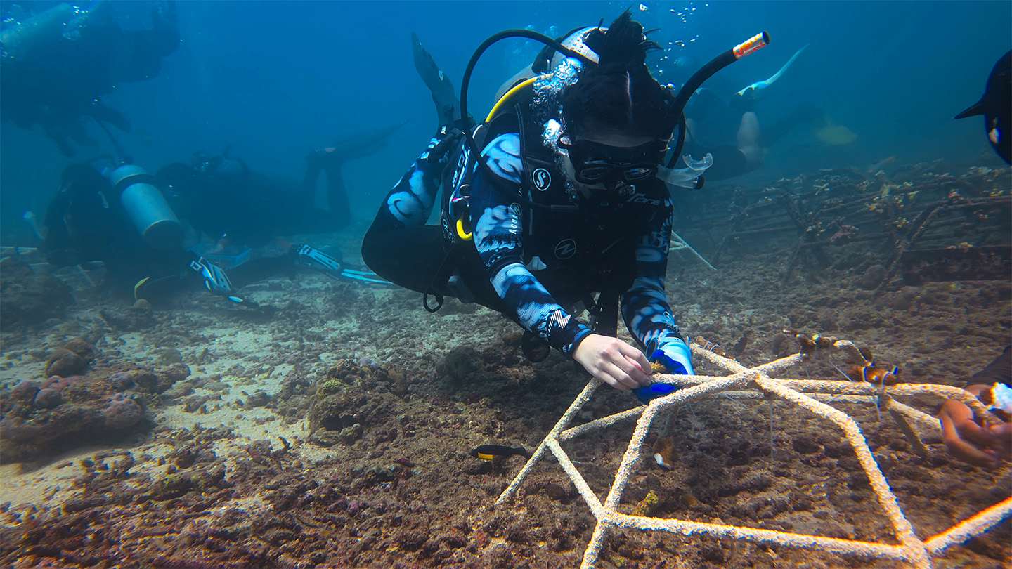 Soon, Brigitta expanded beyond social media. Working with a local diving community and village leaders in northeast Bali, she helped design and build a coral garden on the ocean floor — an artificial structure where coral fragments are planted to help degraded reefs recover, even as oceans continue to warm. Over the past five years, her team has planted over 1,400 coral fragments, with a survival rate of up to 86%.