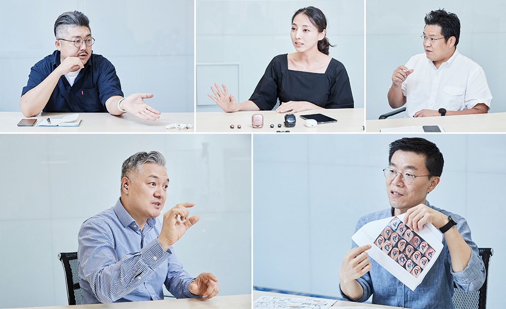 ▲ The designers of the Galaxy Buds Live. (From left) Mingyeong Jang, Youngsang Jang, Sangok Sohn, Tommy Choi, Yongseok Bang and Joonha Kim