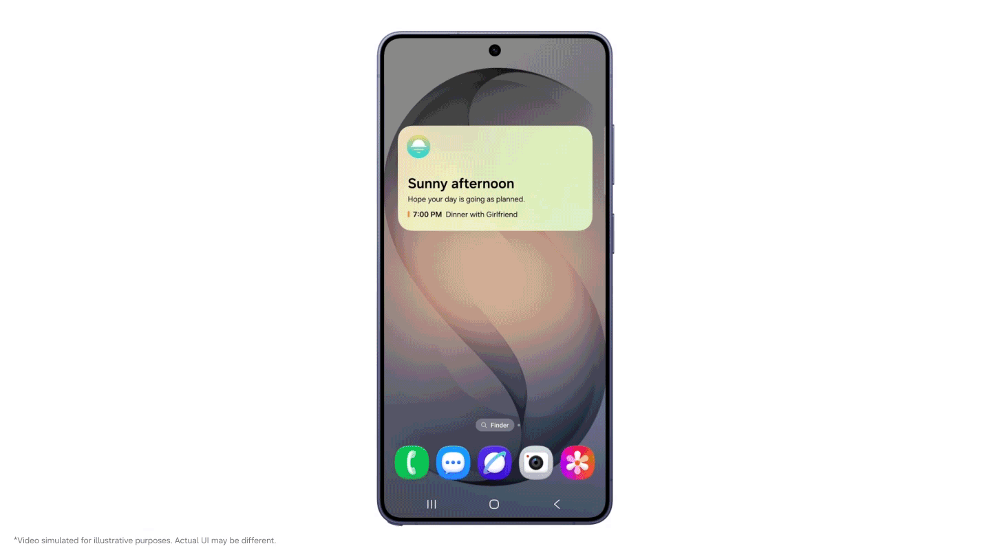 14 Now Brief feature requires Samsung Account login. Service availability may vary by country, language, device model, apps. Some features may require a network connection. The description of photos provided by moments may not align with the user's intent. Notifications must be switched on to be used as the recalled data. Recalled data available from supported app notifications, Messages, Gmail and Samsung Wallet and data collected from Gmail is only applicable if the user consents to Personal Data Intelligent's Gmail read permission. Recalled data for reservation details only available from reservation confirmation messages.