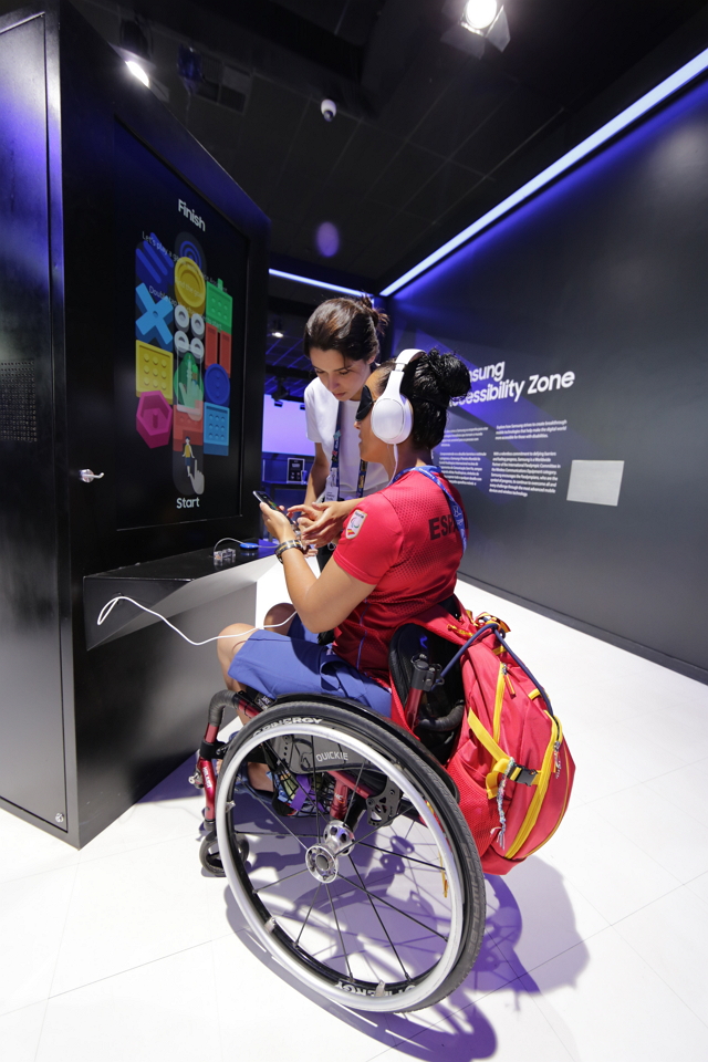 Paralympic Medalist from Spain, Teresa Perales, participates in the Galaxy Accessibility Experience Programs at the Samsung Galaxy Studio in Olympic Park in Rio de Janeiro, Brazil. Teresa tested out the Blind Game during the Rio 2016 Paralympic Games.