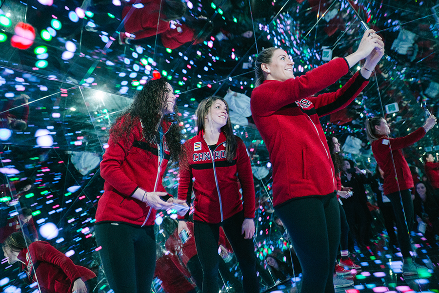 Inside the Infinity Room at Samsung Olympic Showcase @ Gangneung Natalie Spooner, Shannon Szabados, and Rebecca Johnston from Canada’s National Women’s Hockey team experience kaleidoscope like wondrous views controlled by the PyeongChang 2018 Olympic Games Limited Edition.