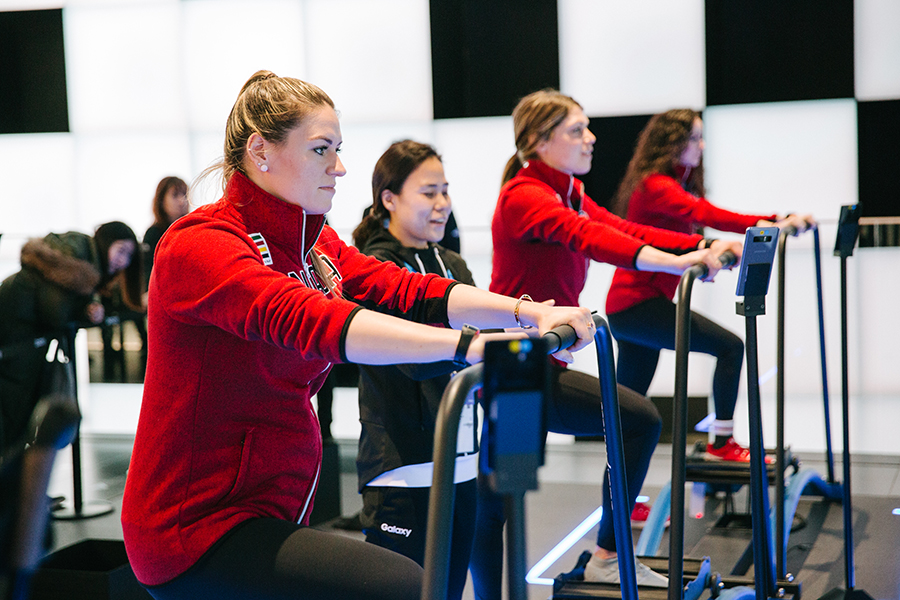 Inside the Social Galaxy room at Samsung Olympic Showcase @ Gangneung, Members of Canada’s National Women’s Hockey team, Shannon Szabados, Rebecca Johnston and Natalie Spooner, see their past Instagram moments and memories that embody “Do What You Can’t” come to life in full 360 during the Olympic Winter Games PyeongChang 2018.