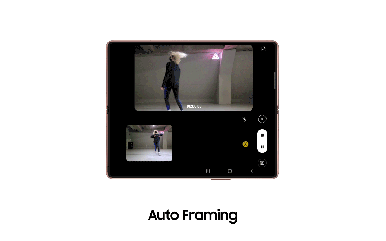 Another camera feature new to the Galaxy Z Fold2 is Auto framing. Available on the Front Wide and Rear Ultra-wide cameras and with a trackable distance of approximately 1.5 to 2.5 meters, Auto framing harnesses machine learning to track the body and face of a subject within the frame and adjust the camera focus accordingly.