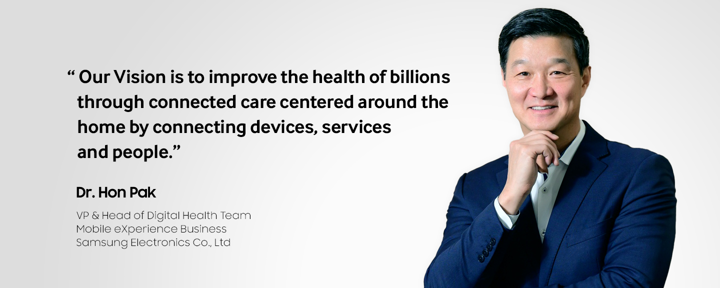 That’s why at Samsung, we’re working to empower more people to manage their health – and those they care for – their way, with a comprehensive, yet simplified approach to everyday wellness. Our vision is to improve the health of billions through connected care centered around the home by connecting devices, services and people – like only Samsung can.