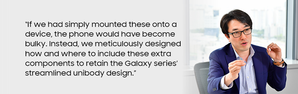 In order to ensure its first 5G device remained as user-friendly and intuitive as consumers have come to expect from the Galaxy series, Samsung developed a major hardware innovation. “Because a 5G phone must support all LTE legacy hardware, adding 5G-specific components such as the 5G modem chip and 5G RF chip naturally involved incorporating additional parts,” explains Choi. “If we had simply mounted these onto a device, the phone would have become bulky. Instead, we meticulously designed how and where to include these extra components to retain the Galaxy series’ streamlined unibody design.” Even after mounting the necessary extra components, the Galaxy S10 5G still possesses a slim, unibody form factor.