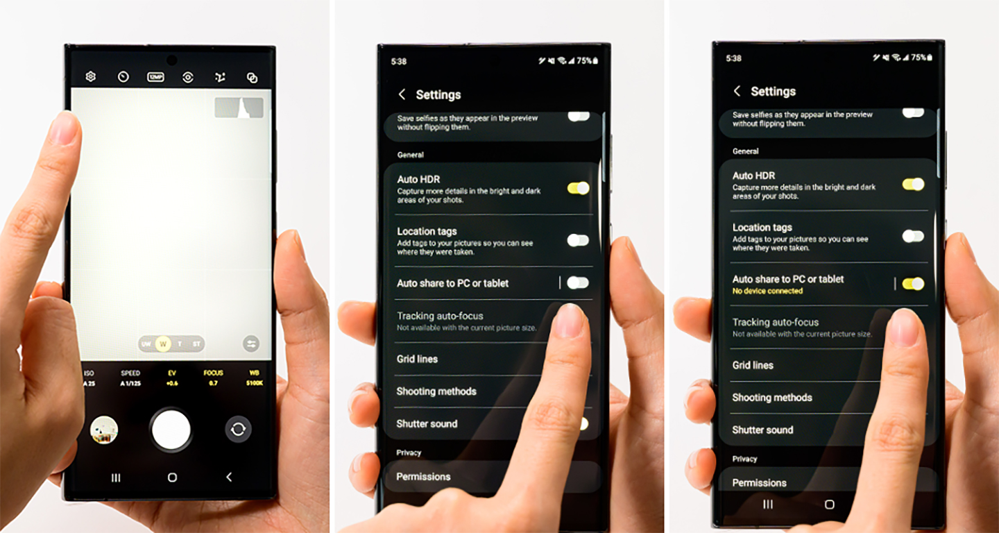 Share photos by turning on the Auto Share feature on the Expert RAW app on your Galaxy S23 Ultra. Once Auto Share is turned on, the RAW file taken with the smartphone is synced directly to the Galaxy Book3 series.