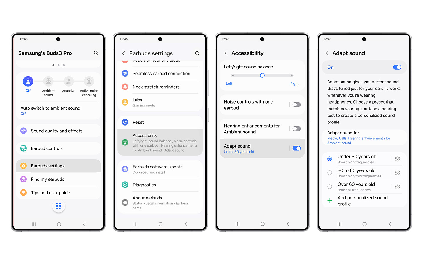 And now, with the rollout of One UI 7, you can access the most convenient and intelligent audio with Galaxy Buds3 and Buds3 Pro. Easily change sound settings on the quick settings panel and have your preferences applied to specific apps, all for your convenience. Plus, users can enjoy the more accessible, personalized audio experience enabled by Adapt sound feature.