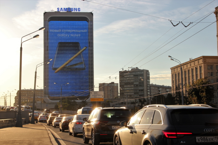 Drivers catch a glimpse of the dynamic Galaxy Note9 OOH campaign during their evening commute in Moscow, Russia