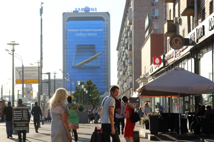 Pedestrians in Moscow go about their day with the Galaxy Note9 campaign on full display behind them