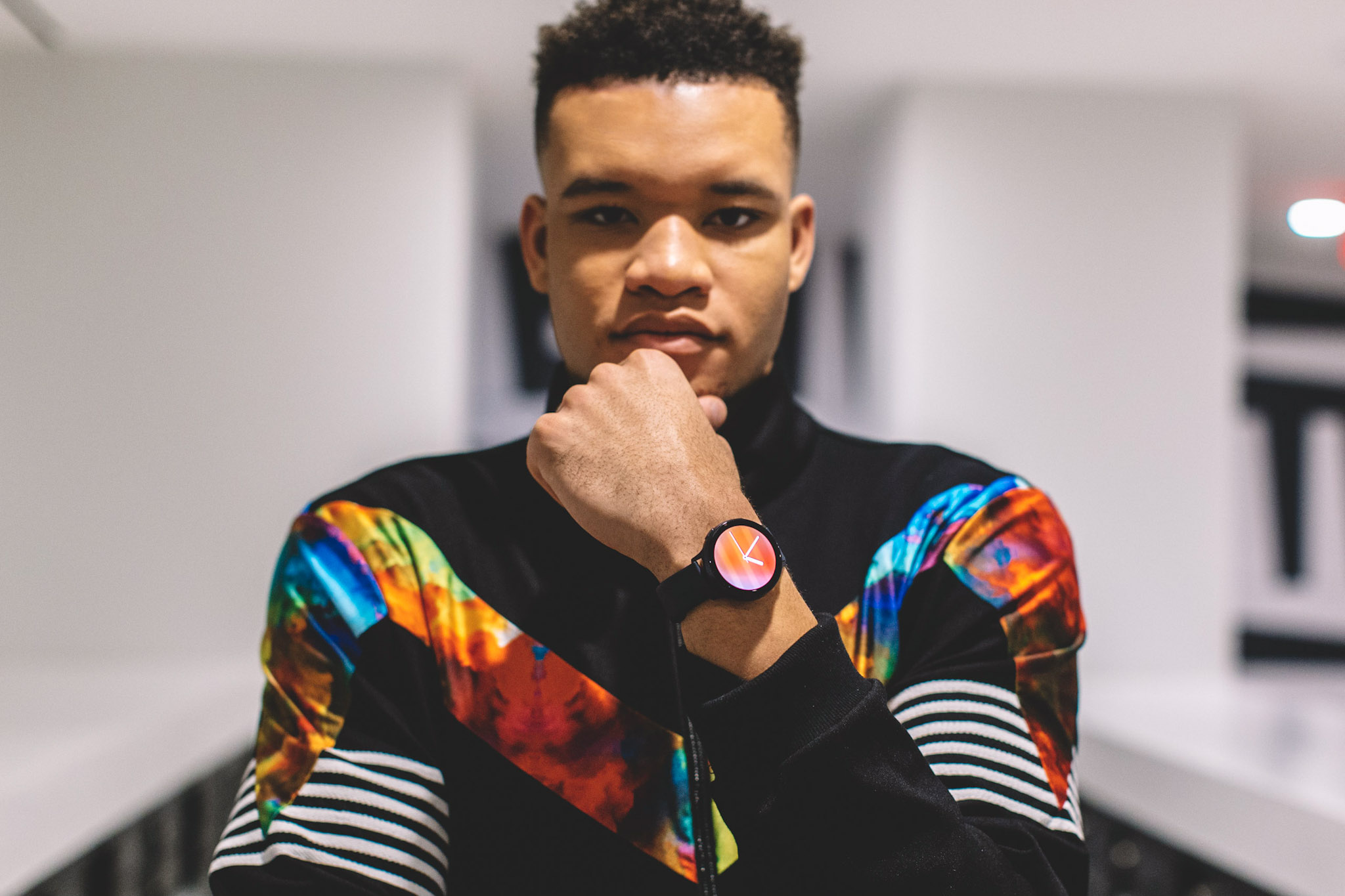 Pro basketball player Kevin Knox models the 44mm Galaxy Watch Active2 in Black with a customizable watchface display for a fresh look paired with the Grungy Gentleman Weather Map Tracksuit.