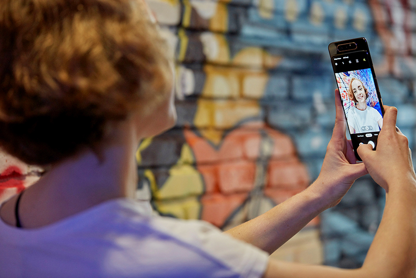 The ability to use the phone’s 48MP main camera for front-facing photos struck us as a game changer. For shots where we wanted to take a selfie while still capturing a significant portion of the background, Wide mode on the selfie camera was ideal. To take the effect a step further, the Galaxy A80 is also equipped with Ultra Wide mode*, which has a viewing angle as wide as that of the human eye, and is perfect for taking wide scenery and nature shots. We had a lot of success using Ultra Wide mode to take front-facing photos too, as it worked well for taking selfies with large groups of people and taking pictures in front of things like large landmarks. What’s more, all of these images were captured in stunning Wide Quad HD quality due to the fact that we were able to use the 48MP main camera to take them.