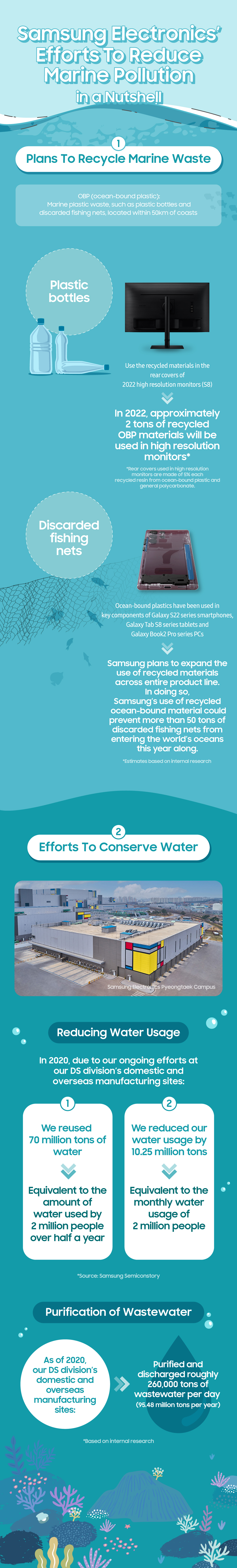 Check out the infographic below to learn more about how Samsung is reducing marine pollution by transforming OBP into parts for monitors and mobile devices including smartphones, and by purifying wastewater at its semiconductor plants.