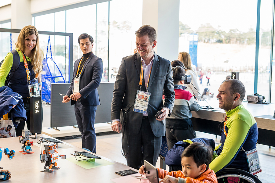 IPC President Andrew Parsons visited the Samsung Paralympic Showcase @ Gangneung during the PyeongChang 2018 Paralympic Winter Games to take part in the immersive technology experiences offered by Samsung. President Parsons took a tour of the Showcase where he explored Samsung’s latest wireless communications products along with members of the IPC marketing team.