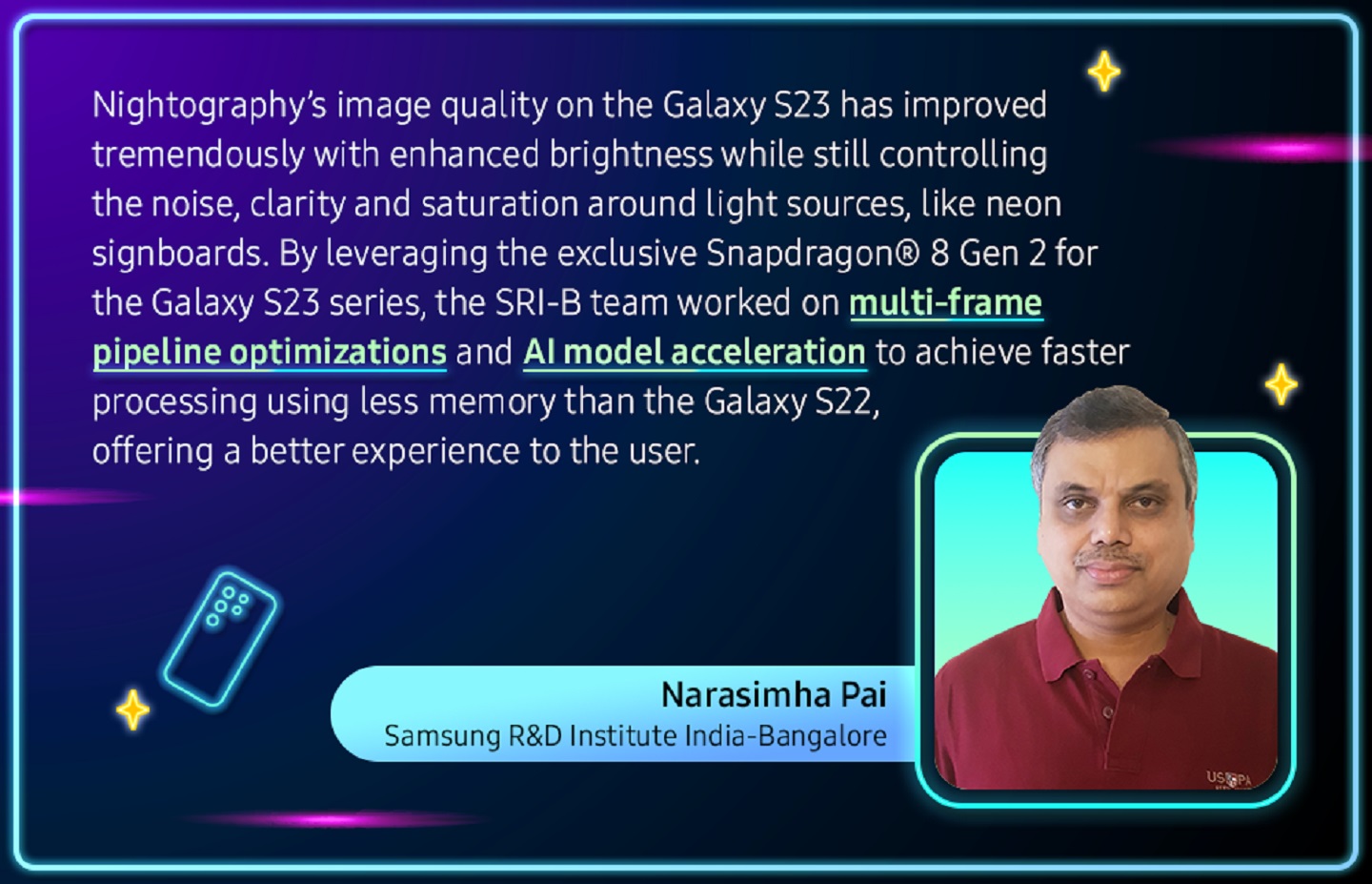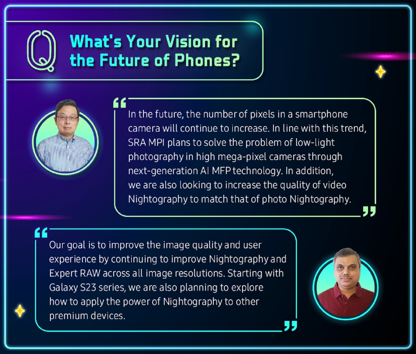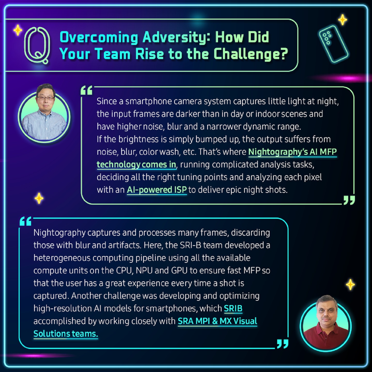 Read on to see what John Seok-Jun Lee, Head of Computational Camera Part at Samsung Research America (SRA), and Narasimha Gopalakrishna Pai, Head of AI Computational Imaging Part at Samsung R&D Institute India-Bangalore (SRI-B), had to say about their joint development of Nightography, the best way to take crisp photos and videos from dusk until dawn.