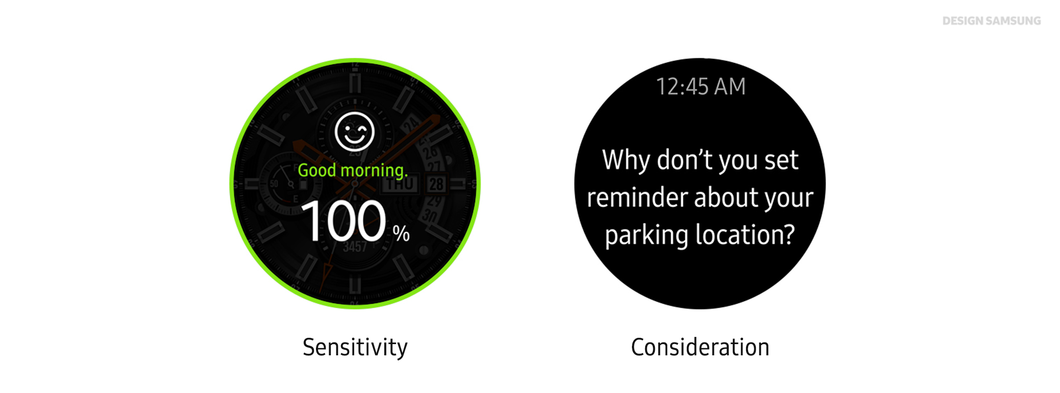 From a smiling icon that pops up when the battery is fully charged to tutorial animations that teach users how to exercise, the many different enjoyable and sentimental visuals featured on the Galaxy Watch provide users with a profound sense of joy. Furthermore, by integrating the sound of a ticking clock that can be heard when a user puts their ear close to the watch, we made sure to capture the auditory sentiments of a real watch.