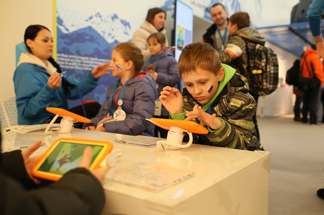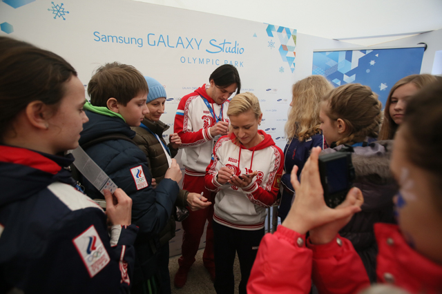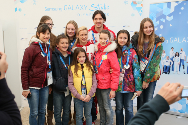 Samsung Galaxy Team members and gold medalist figure-skaters Tatiana Volosozhar and Maxim Trankov, held an interactive session with Russian kids from the Sochi Gymnasium #1 in Samsung GALAXY Studio Olympic Park to spread the Olympic spirit and a message of inspiration to dream.