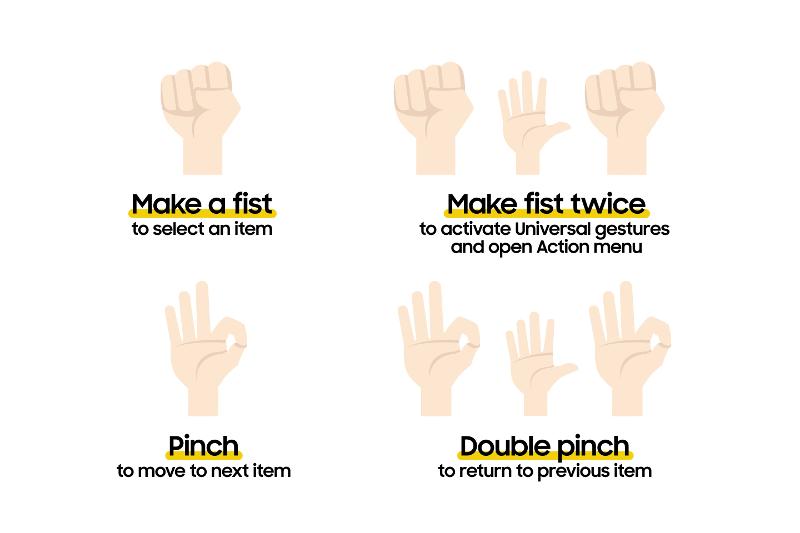 Universal Gestures offers an innovative way to use your Galaxy Watch touch-free. With four intuitive gestures, Make Fist, Make Fist Twice, Pinch and Double Pinch, users can navigate their Galaxy interface, open apps, scroll messages and more, without needing to push down or touch the screen with force.