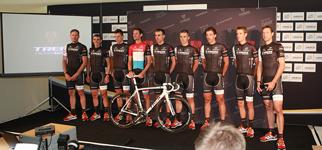 Samsung announced a global partnership with Trek Bicycle on July 3rd. Trek Factory Racing Team are posing at the partnership annoucement press conference in Leeds, UK.