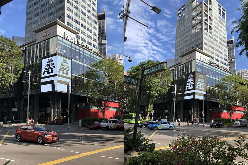 Vehicles zoom past an eye-catching billboard display on the side of Singapore’s The Hereen building