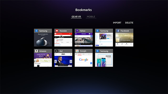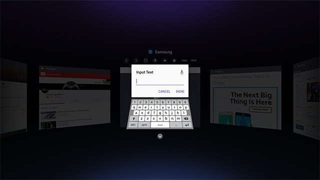 Furthermore, in order to make text input intuitive and easy, Internet for VR provides voice recognition, along with on-screen keyboard. With Gaze Mode, users can select menus by simply gazing at them, without having to lift a finger. The app can also import bookmarks from the mobile web browser, Samsung Internet for Android, and provides helpful features such as Quick Access, Bookmarks and Tab Manager, giving users a familiar web browsing experience.