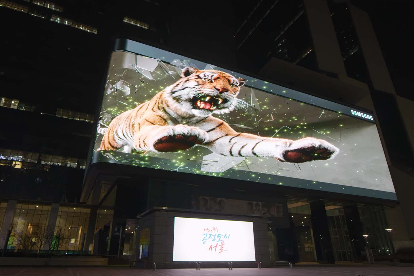 Samsung Galaxy’s 3D tiger leaps right out of the COEX billboard in Seoul.