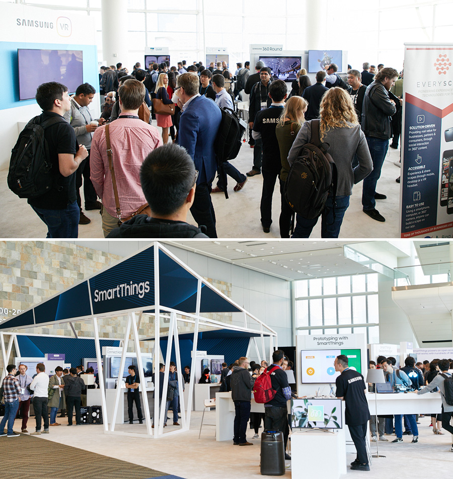 Attendees examine the wide range of Samsung technologies on display at SDK 2017.