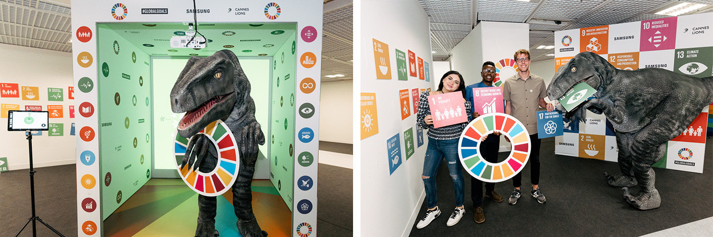 Frankie the Dino (Utahraptor and UNDP Climate Activist) visiting Samsung Global Goals Photobooth