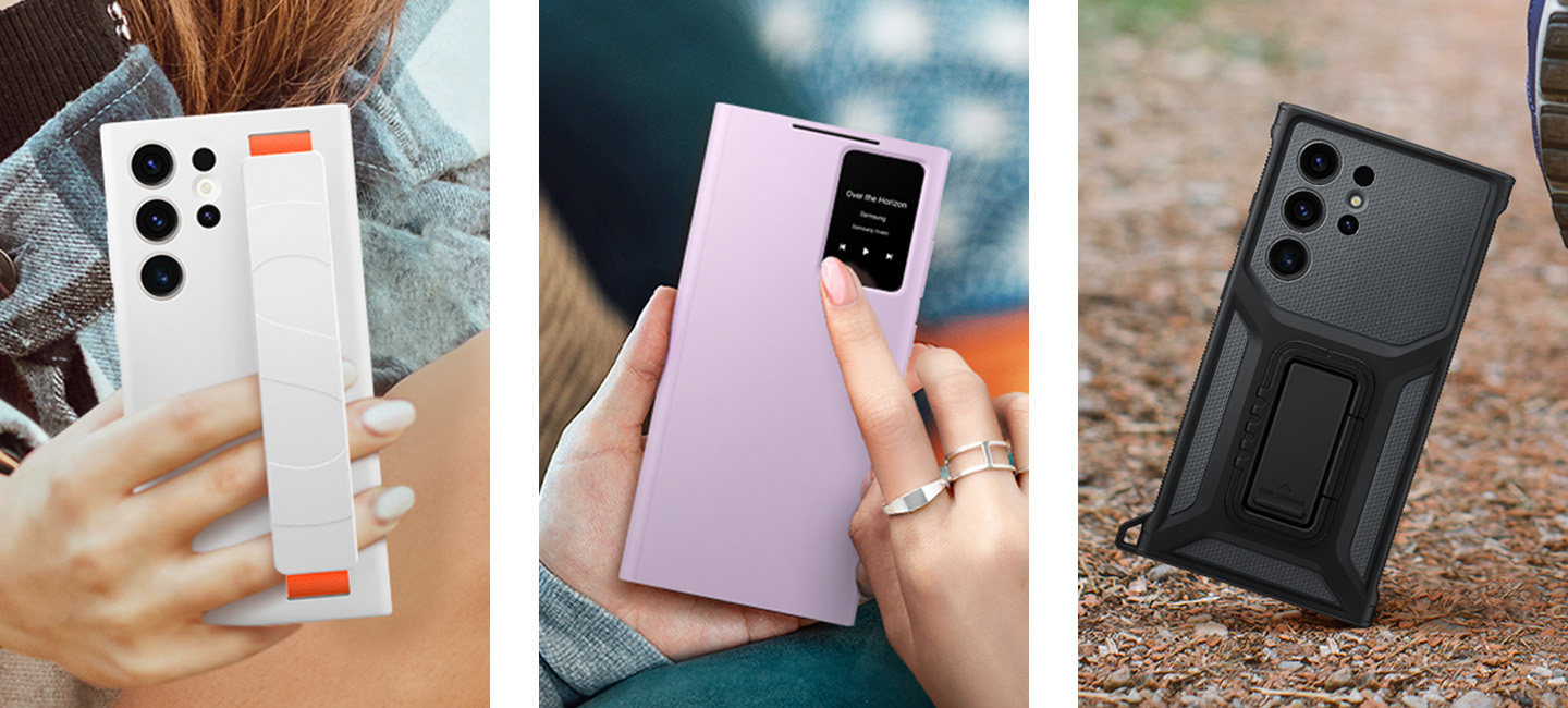 1 Galaxy S23 series cases inclusive of, Clear Case, Silicone Case, Leather Case, Smart View Wallet Case, Silicone Grip Case, Frame Case, Clear Gadget Case and Rugged Gadget Case. Availability of each may vary by region.