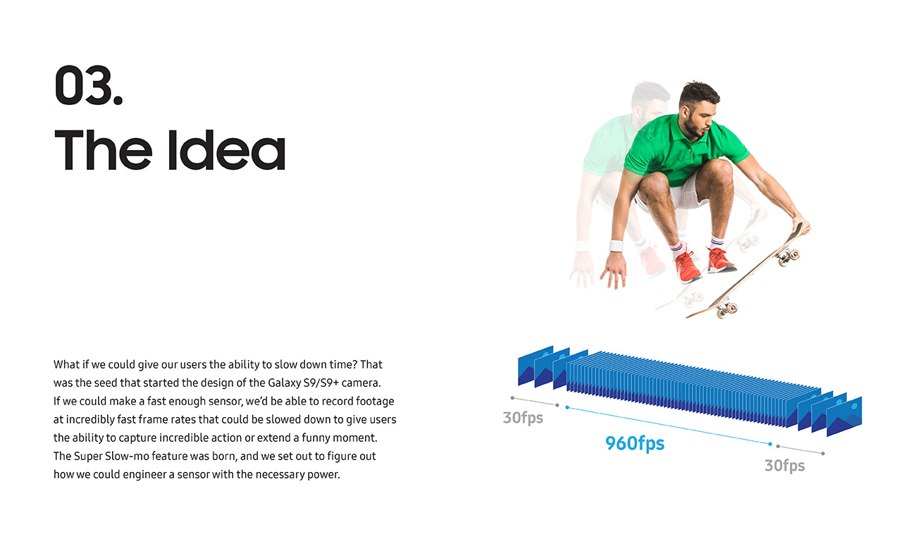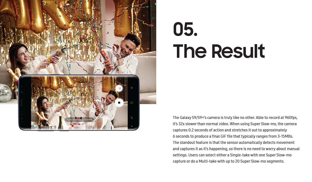 With the new Super Slow-mo feature, which can capture 960fps, Samsung aimed to show new perspectives on the moments you might typically miss. Rather than simply filming videos that will be forgotten in your phone’s gallery, you’re making memories out of hidden moments that you’ll want to share. With endless customization including background music and GIF loop, reverse, and swing, sharing your memories with friends and family is more fun than ever before.