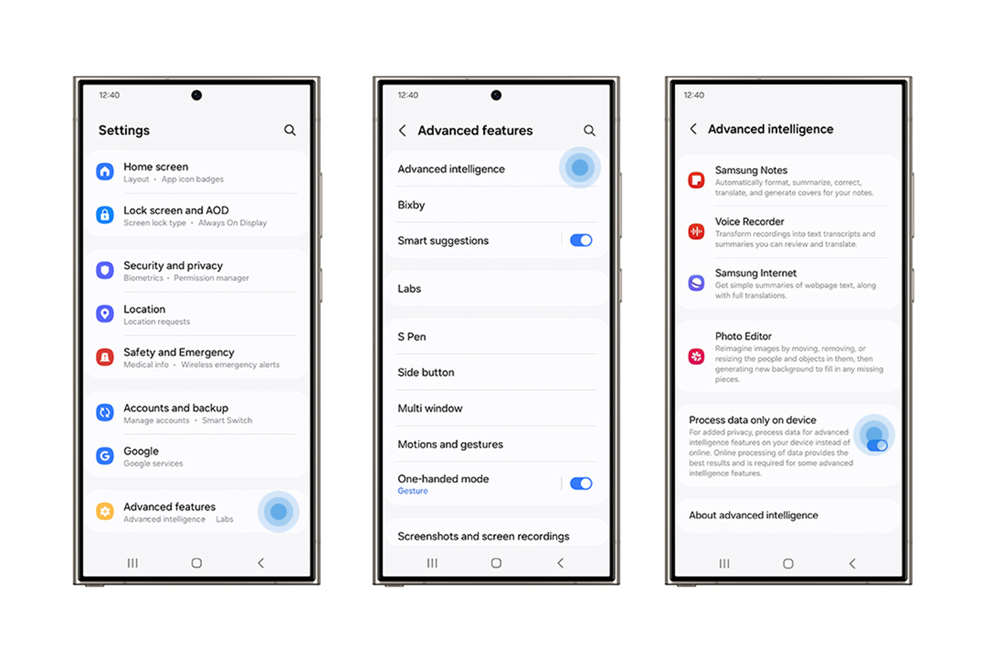 To access the settings, open Settings and select Advanced features, then Advanced Intelligence. Here, you’ll see the option to “Process data only on the device."