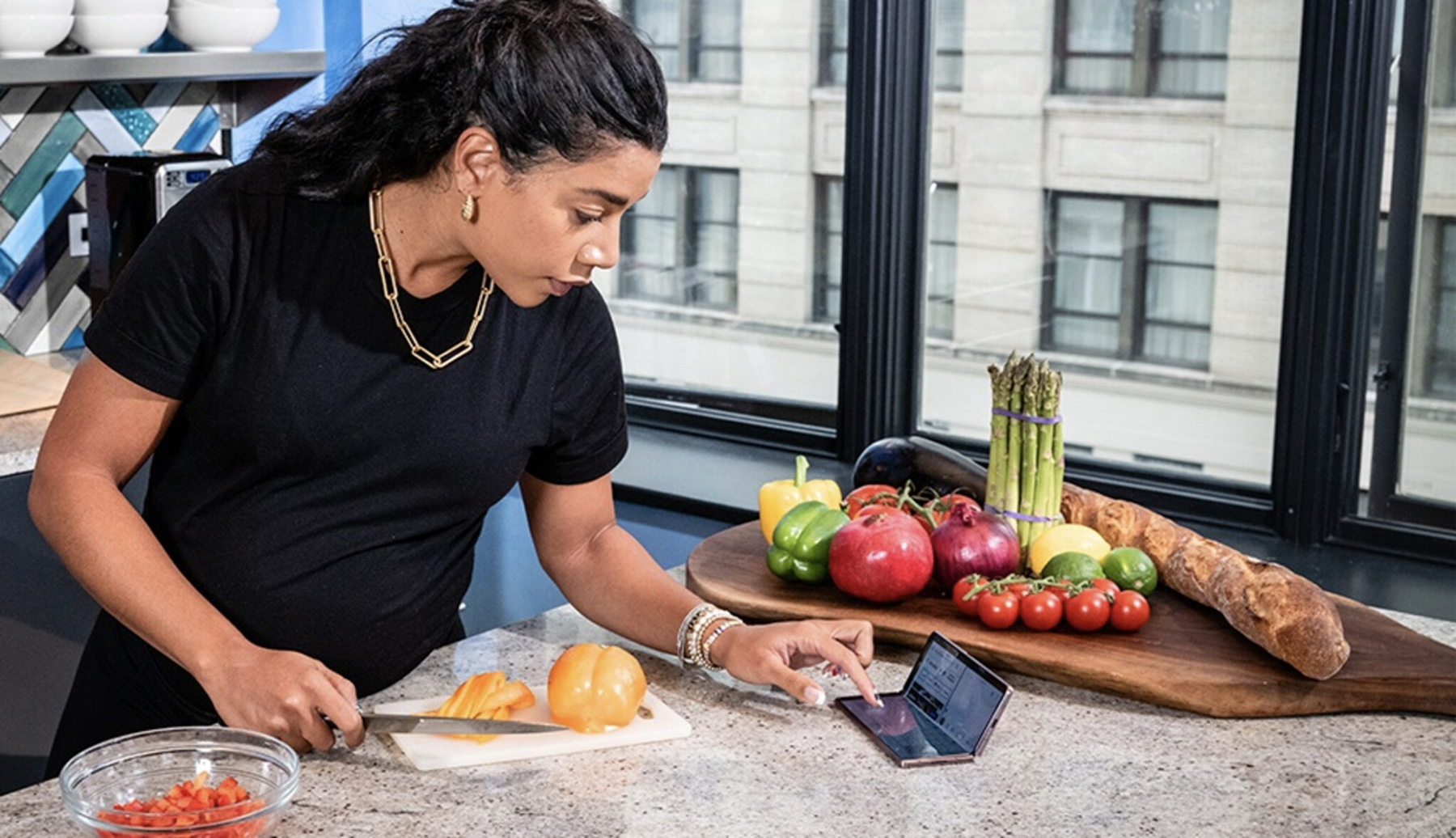 Thanks to the phone’s cutting-edge Flex mode, which lets users fold the phone and watch the screen hands-free, she no longer has to go searching for bowls to prop the phone up when she’s following a workout, watching cooking tutorials online (“Just the other day, I pulled up a video on how to braid challah bread”), or learning how to apply makeup or style her hair via YouTube.