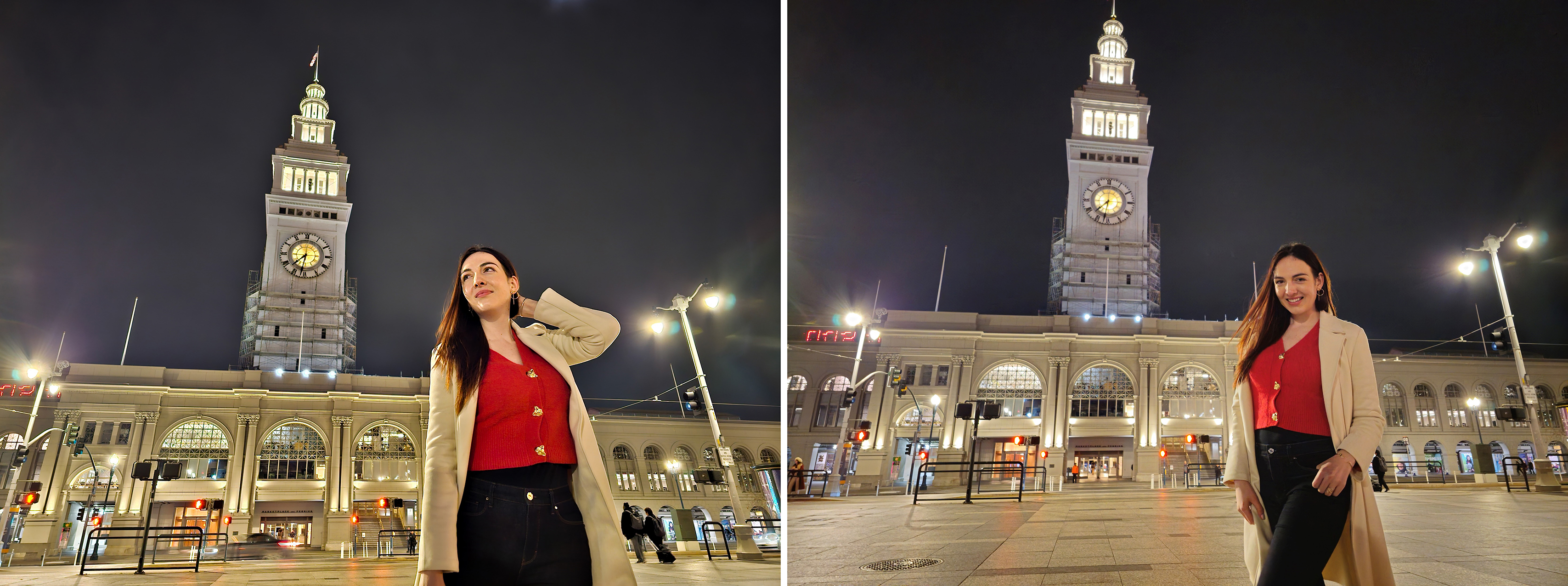 After moving to another location, we experimented with Nightography in the square in front of the Ferry Building. While there was more light, it was now well into the night. This was no challenge for Nightography, allowing for an epic selfie to be taken in the heart of the city with the lights from the streetlights and the surrounding buildings in the background.