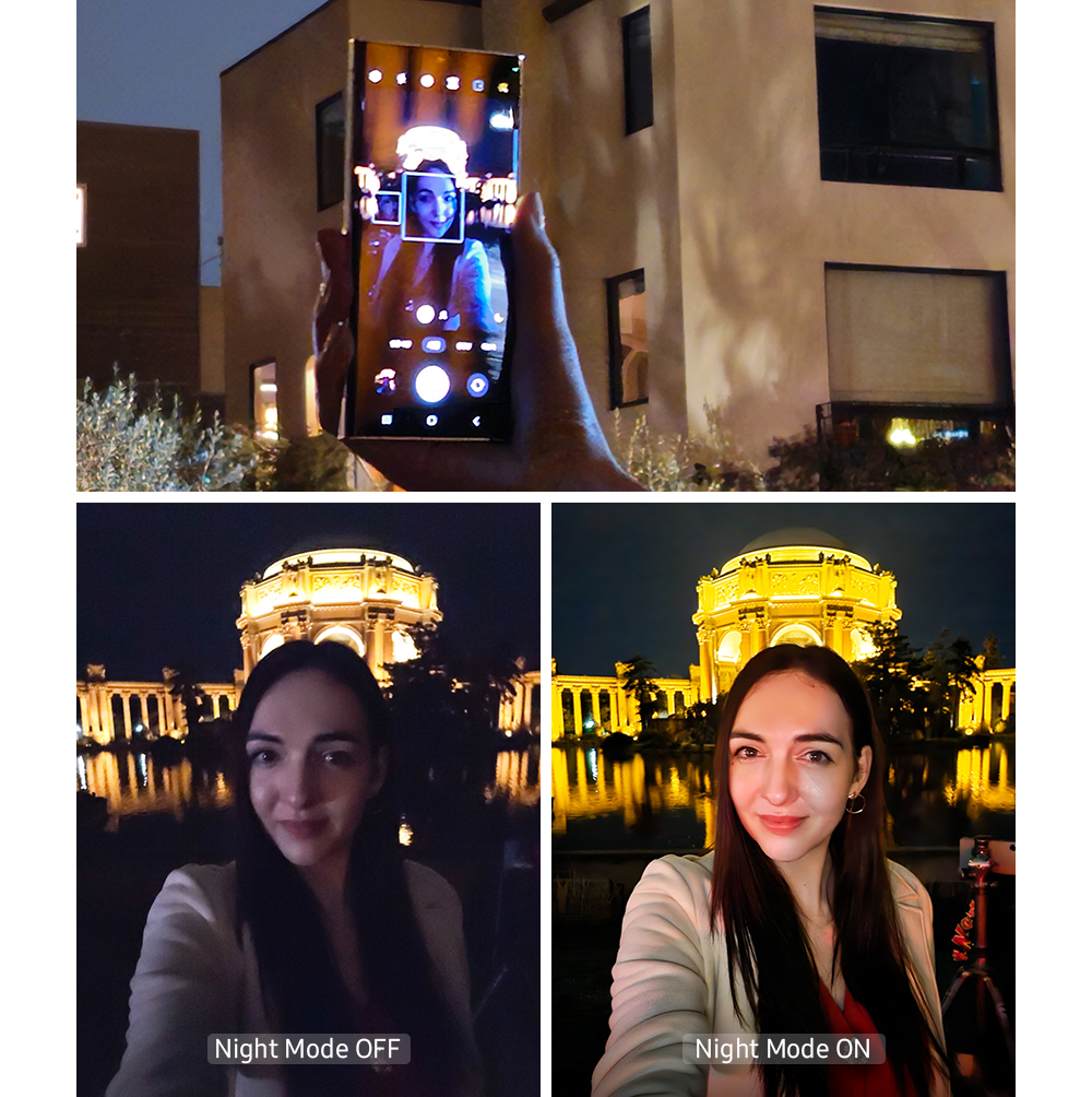 Taking beautiful selfies in the dark has never been easier thanks to Nightography (top). Selfies captured in the dark using Night Mode (right) provide enhanced details and brightness for stunning photos in dark or poorly lit places.