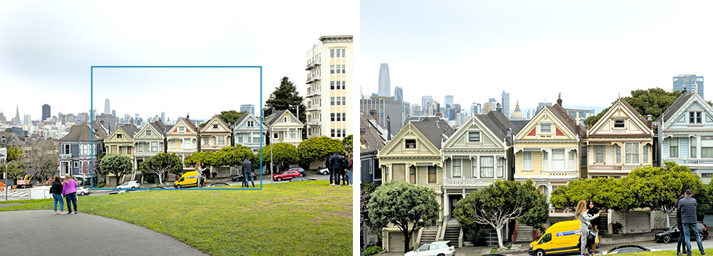 Painted ladies houses captured on using the Galaxy S23 Ultra’s 200MP camera (left) and the same photo zoomed in and cropped (right)