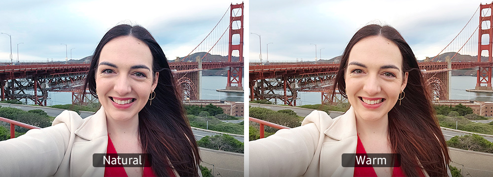 On the Galaxy S23 Ultra, the color tone setting adds a warm tone to the front-facing camera, an update from previous models which used a natural tone, to add a warm hue to any selfie. Users can choose different options when taking a selfie depending on the mood of the photo and their skin tone for a truly personalized and optimized selfie-taking experience.
