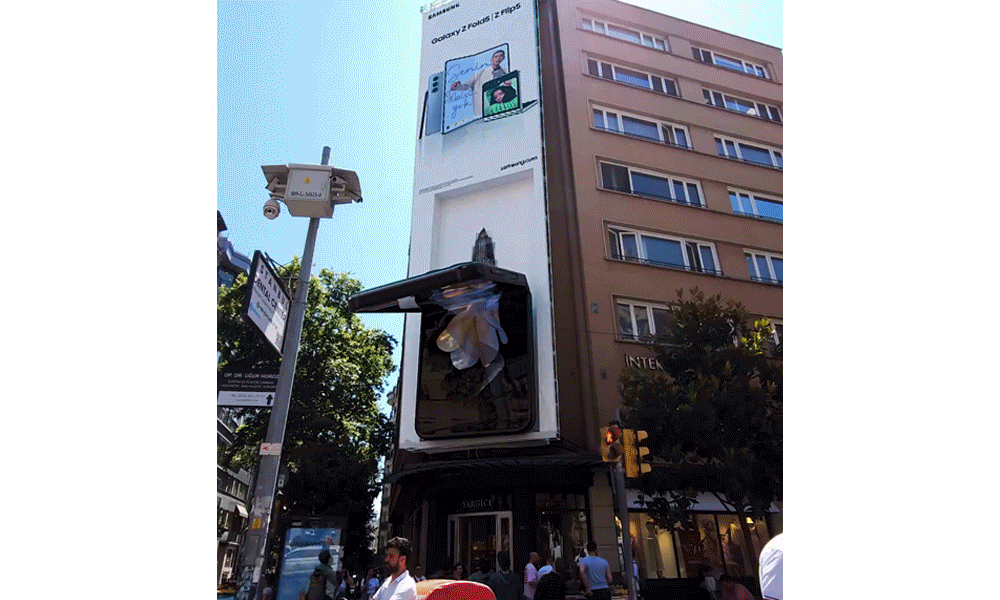 The giant next-gen Galaxy devices were brought to life in these global locales thanks to a combination of real-world images and CGI mastery. Beginning in Istanbul in collaboration with Turkish influencer Bulut Şahin, they soon started appearing in key markets all around the world. Using advanced video editing techniques, moving cameras and rotoscope technology, these huge, photorealistic foldables were superimposed onto footage of actual billboards and buildings. Rendered at a large scale but in meticulously realistic detail, the digital models capture viewers’ imaginations by showing the new foldables’ distinctive form factors inserted into familiar settings.