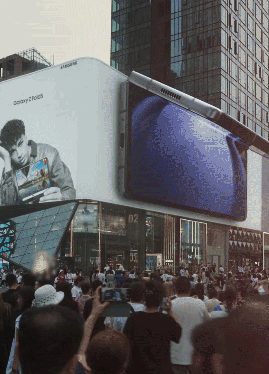 Crowds gather around the Sino-Ocean Taikoo Li Mall in Chengdu as a huge Galaxy Z Fold5 unfurls horizontally on a wraparound digital billboard