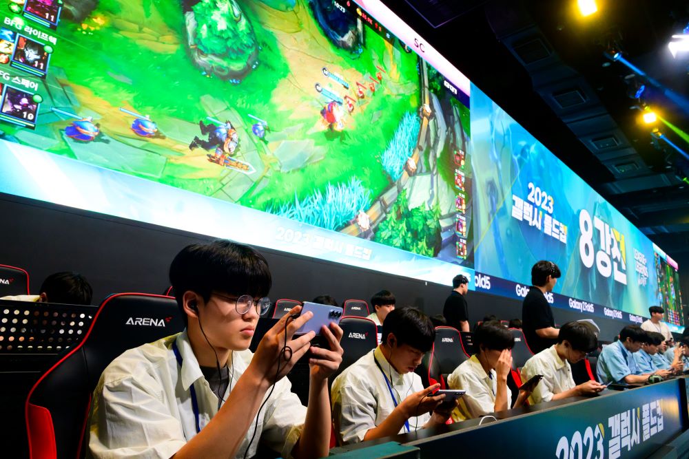 Esports enthusiasts watch teams clash on Galaxy Z Fold5 at the Jamsil eSports Arena in Seoul
